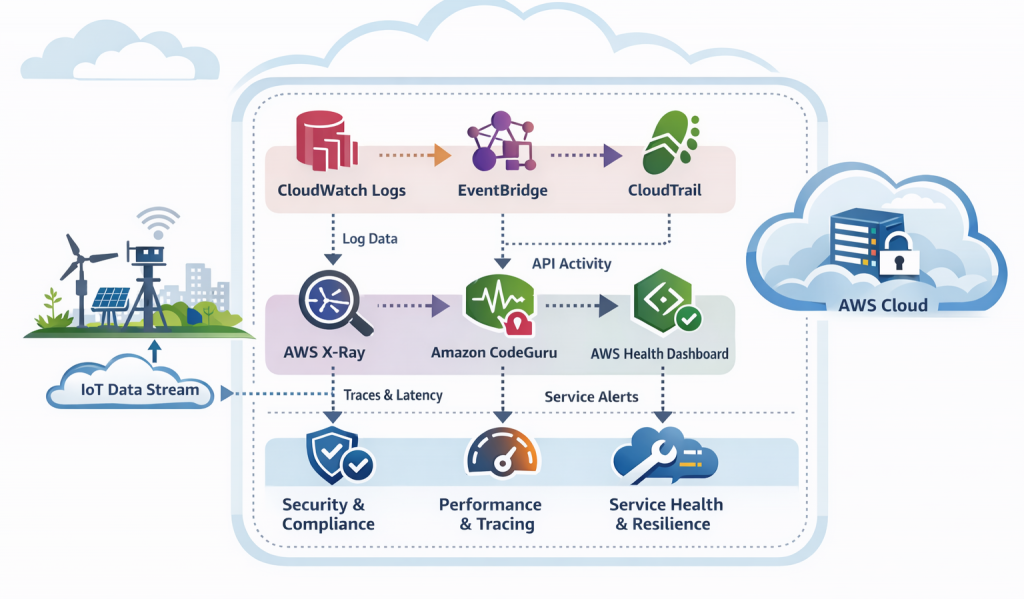 Cloud monitoring in AWS is often reduced to dashboards and alerts, but in practice it is the backbone of operational resilience and security assurance, especially in distributed IoT systems. In low power IoT deployments such as LoRaWAN based agriculture networks, edge assisted sensing platforms, or microgrid testbeds, telemetry does not stop at the gateway. It flows into cloud services where it is processed, stored, analyzed, and acted upon. Monitoring in this context is not only about uptime. It is about traceability, anomaly detection, compliance evidence, and understanding system behavior under constrained and adversarial conditions.